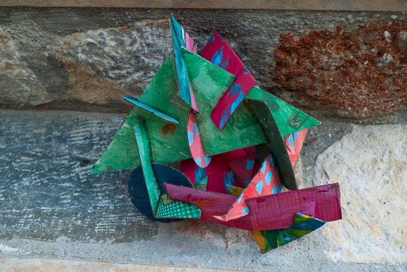 Δημιουργία μικρογλυπτών από χαρτόνι και τέμπερες. Ουδέτερες αρχικά επιφάνειες από χαρτόνια συσκευασίας, αποκτούν χαρακτήρα μέσα από τον χρωματισμό τους με αφηρημένες χρωματικές κλίμακες και μοτίβα. Κατόπιν αφού κοπούν σε μικρά και μεγάλα γεωμετρικά σχήματα, συνδέονται μεταξύ τους διαμορφώνοντας ευφάνταστα γεωμετρικά μικρογλυπτά.